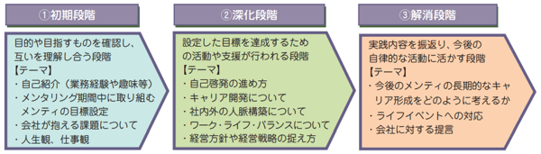 実際のメンタリングは、初期・深化・解消という3つの段階を経て進行します。初期段階では自己紹介や意見交換を行い、互いの考えを理解し「相手を知る」ことを意識して進めていきましょう。