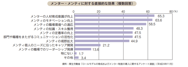 実際に厚生労働省による調査でも、下表のとおりメンター制度による効果として、メンティーのモチベーション向上をはじめ、職場環境への適応や定着率の向上が示されています。