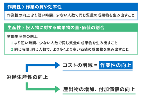 しかし、作業性の向上には「成果物を増やす」「付加価値額を増やす」といったニュアンスは含まれません。産出量・付加価値額、成果物のクオリティを下げずに、いかに短い時間、少ない人数で作業を遂行できるかを重視します。