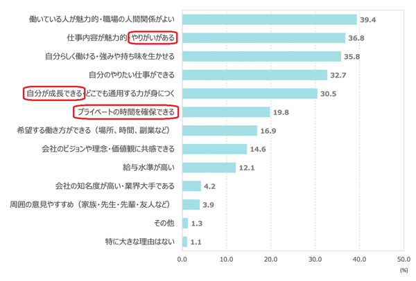 実際に、リクルートマネジメントソリューションズが近年実施した調査では、就職先の会社を選ぶうえで重視したポイントについて、やりがいや自己成長、プライベートといったワードが上位に並びました。